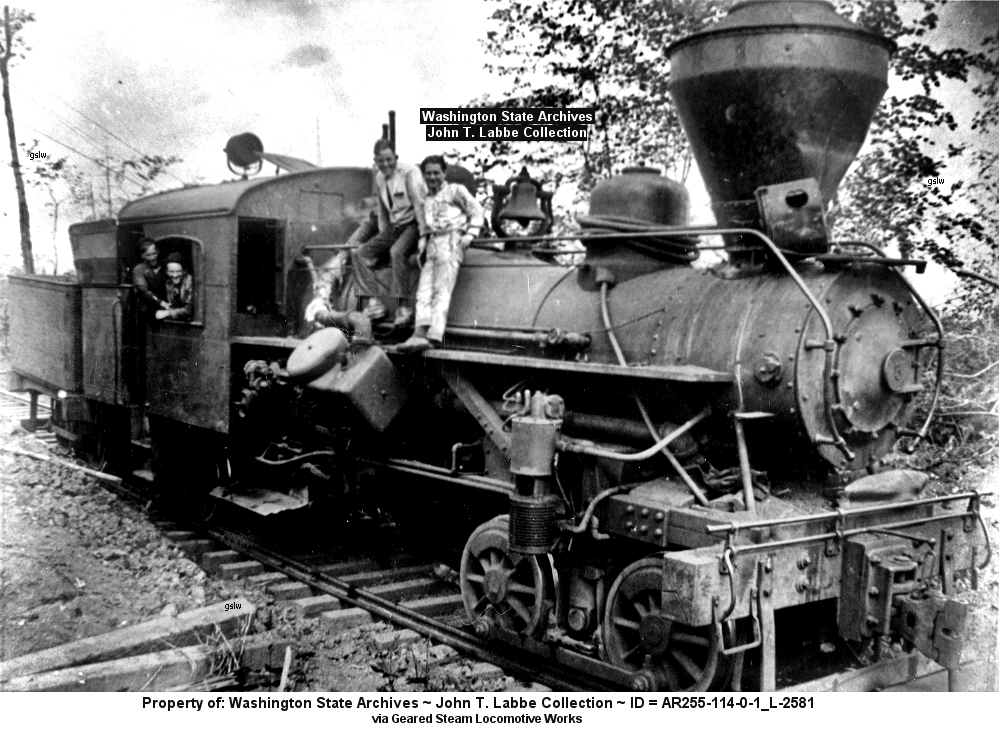 1444 Built 09-1909 ~ Std gauge ~ 75 tons ~ 3 trucks 130d The locomotive operated near Packwood, Washington Image details: ~ Top : from the The Timberman periodical ~ page 103 ~ August, 1922 ~ Bottom: from the Washington State Archives ~ John T. Labbe Collection ~ ID = AR255-114-0-1_L-2581 |