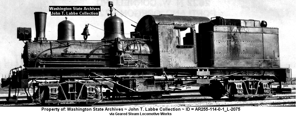 1942 Built 07/30/1907 - Std gauge - 11" x 12" cylinders - 32" drivers - 50 tons - 2 trucks The locomotive operated near Brighton, Oregon The photo is from the Washington State Archives ~ John T. Labbe Collection ~ ID = AR255-114-0-1_L-1286 |