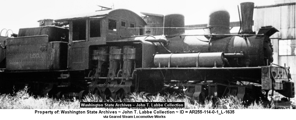 s/n 1939 Built 06/29/1907 ~ Std gauge ~ 12" x 12" cylinders ~ 36" drivers ~ 60 tons ~ 2 trucks The locomotive operated near Black Rock, Oregon The photos are from the Washington State Archives ~ John T. Labbe Collection with the following IDs: ~ Top : AR255-114-0-1_LL-002732 ~ Middle : AR255-114-0-1_LL-002731 ~ Bottom: AR255-114-0-1_LL-1948 |
