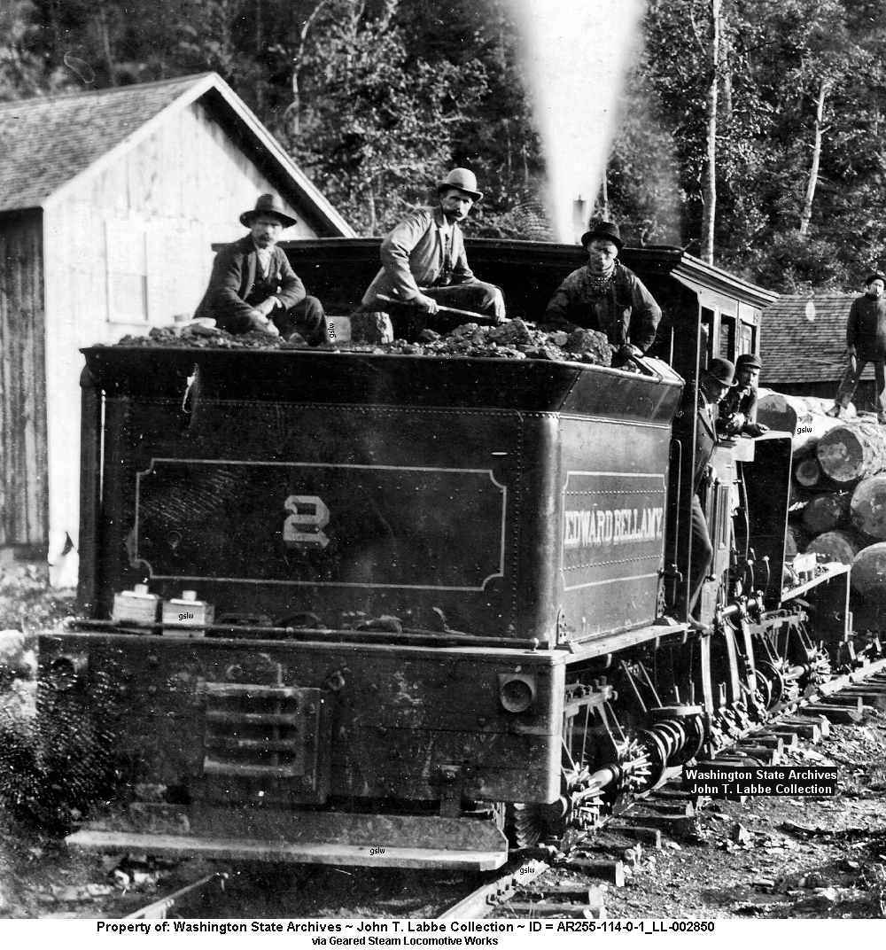 s/n 325 Built 01/27/1891 ~ Std gauge ~12" x 12" cylinders ~ 32" drivers ~ 50 tons ~ 2 trucks The locomotive, named "Edward Bellamy" was owned by McClelland & Kane. It operated near Kushequa, Pennsylvania Photo details: ~ Top : published in "Sawmills Among the Derricks" ~ Bottom: from the Washington State Archives ~ John T. Labbe Collection ~ ID = AR255-114-0-1_LL-002850 |
